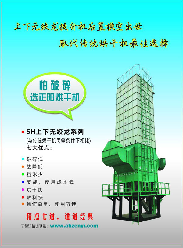 為了更好的滿足市場(chǎng)和客戶的需求,正陽科技推出一款“上下無絞龍系列”谷物烘干機(jī)。糧食破碎霉變猛于虎,正陽烘干機(jī)保護(hù)糧食安全保護(hù)人類健康。正陽烘干機(jī)上下無絞龍系列比傳統(tǒng)烘干機(jī)節(jié)能減耗,是中國(guó)糧食烘干機(jī)上下無絞龍?zhí)嵘龣C(jī)后置發(fā)明者與領(lǐng)航者。